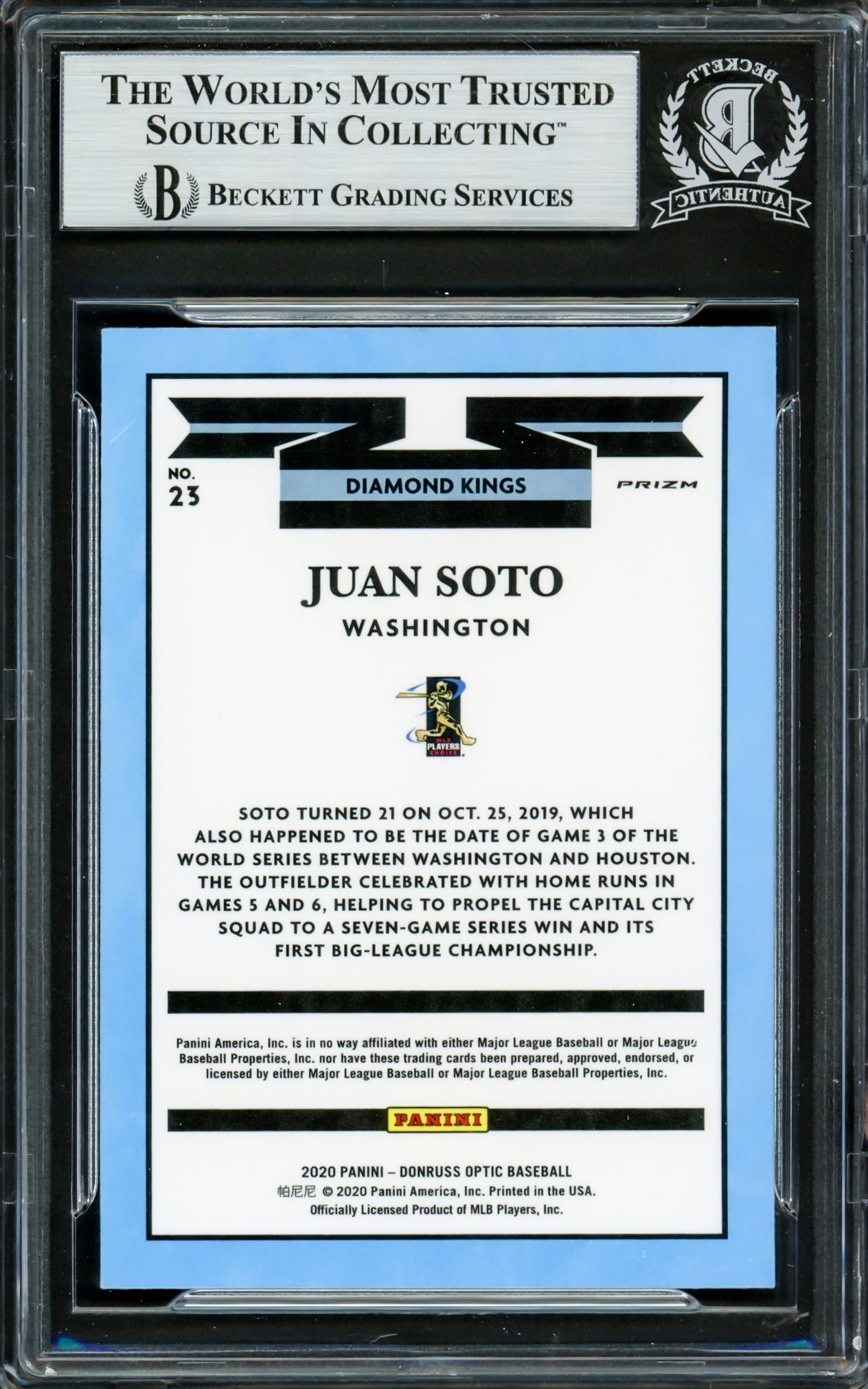 - Official 2020 Donruss Optic Diamond Kings Blue & White Prizm Card #23 featuring Juan Soto.