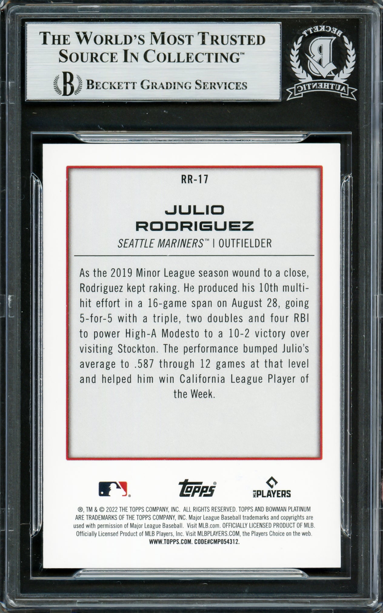Julio Rodriguez Autographed 2022 Bowman Platinum Renowned Rookies Rookie Card #RR17 Seattle Mariners Beckett BAS #16706202