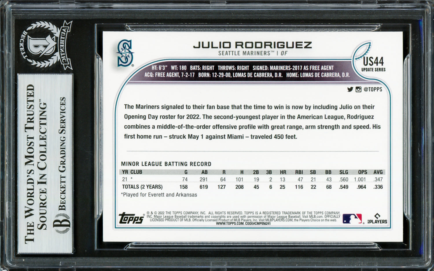 Own a piece of baseball history with this 2022 Topps Update Blue Rookie Card #US44, hand-signed by Julio Rodríguez—one of the most electrifying young stars in the game. This rare collectible has been certified authentic by Beckett Authentication Services (BAS) and is securely encapsulated in their tamper-proof holder for long-term protection. Perfect for collectors and Mariners fans, this item is a must-have addition to any memorabilia collection.
