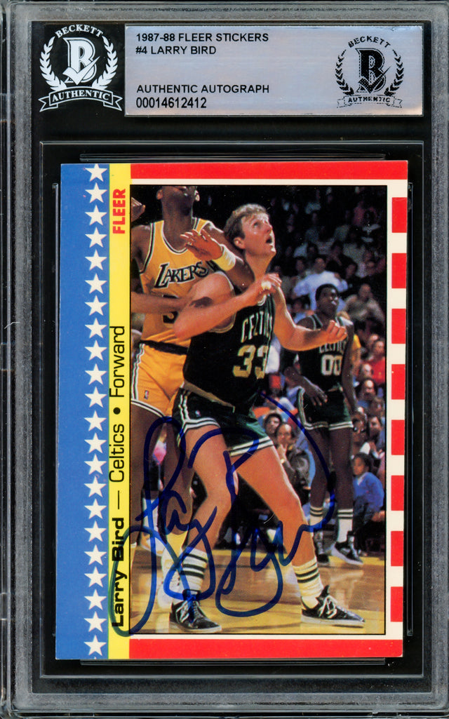 Own a piece of basketball history with this 1987-88 Fleer Sticker Card #4, hand-signed by the legendary Larry Bird. This rare collectible is a must-have for Boston Celtics fans and memorabilia enthusiasts alike. Authenticated by Beckett Authentication Services (BAS), this signed card is securely encapsulated in their tamper-proof holder for long-term preservation.