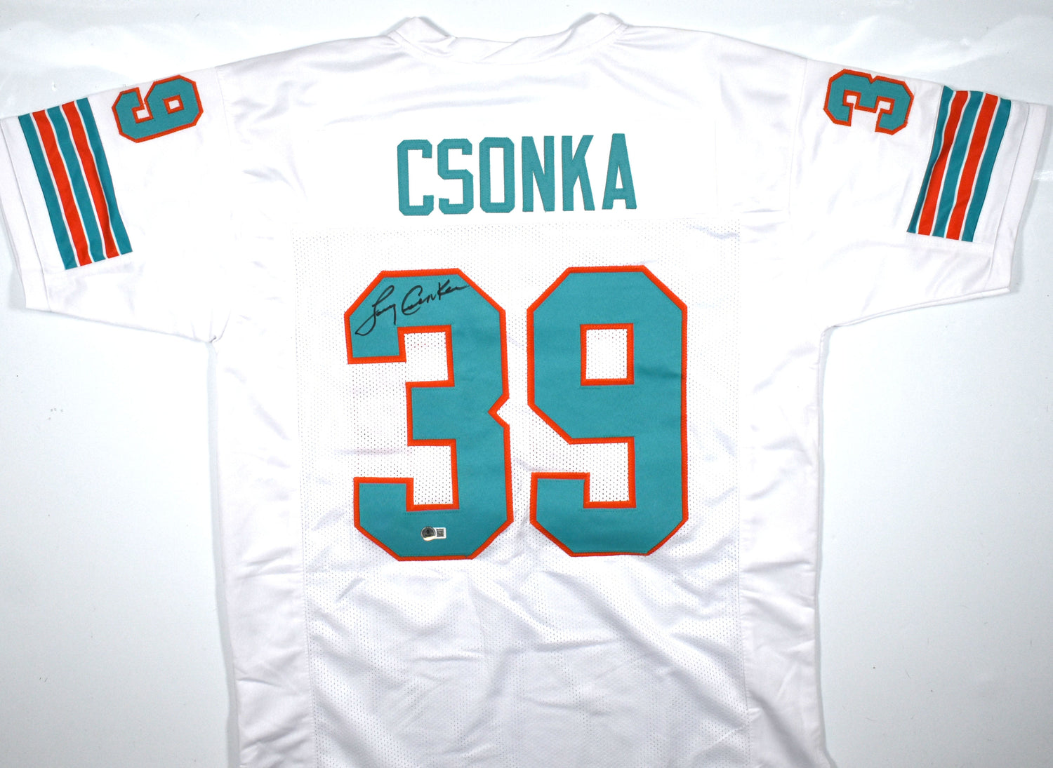 Own a piece of football history with this Larry Csonka Autographed Custom Jersey—a must-have for passionate Miami Dolphins fans and collectors. This authentic-style jersey is custom-made (non-name brand) and features stitched letters and numbers, ensuring a top-quality display piece. Please note: This is not an officially licensed NFL jersey; it has no tags, logos, or emblems.