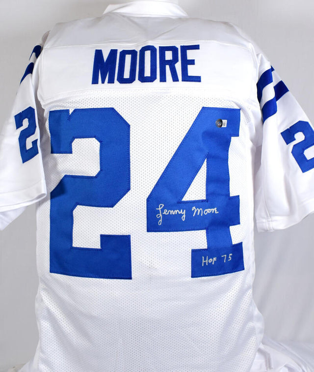 Lenny Moore Autographed White Pro Style Jersey w/HOF-Beckett W Hologram *Silver is backordered and will ship as soon as it is back in stock.