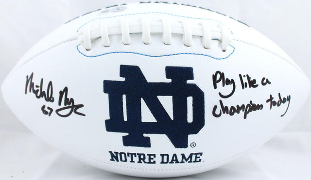 Own a piece of Notre Dame Fighting Irish history with this hand-signed Michael Mayer logo football, featuring the inspirational inscription "Play Like a Champion." This collectible is a must-have for Fighting Irish fans and football memorabilia collectors alike.