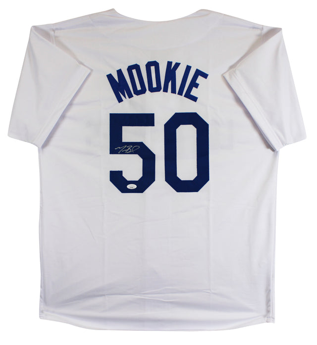 Display-Ready Fan-Grade autographed and signed Mookie Betts white pro style jersey—premium MLB memorabilia, JSA verified. Betts is a former AL MVP and two-time World Series champion (2018, 2020) who has been a cornerstone of the Los Angeles Dodgers. A perennial All-Star with multiple Gold Gloves and Silver Sluggers, he exemplifies elite two-way play in today’s MLB.