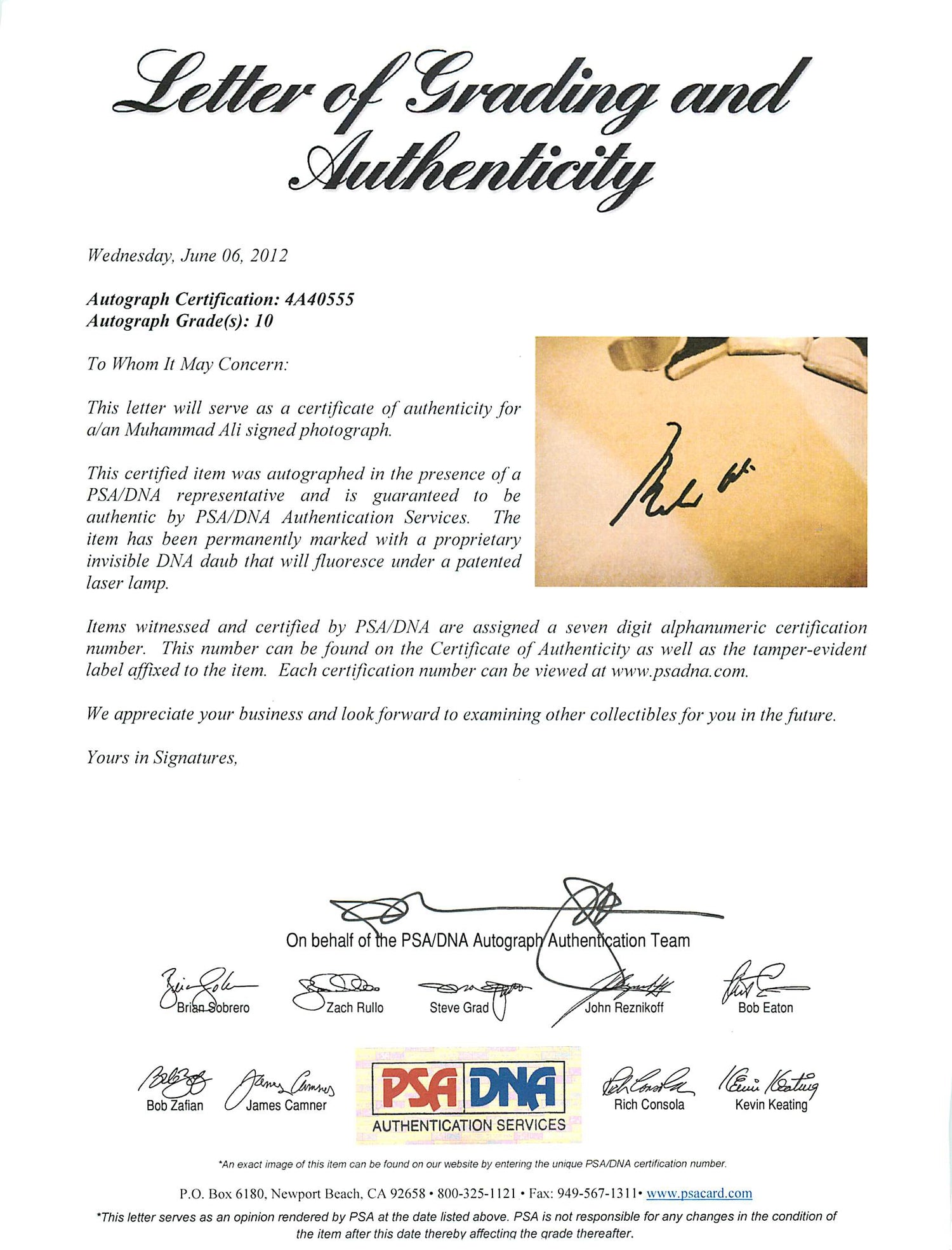 Own a rare piece of boxing history with this authentic 30x40 signed photo personally autographed by the legendary Muhammad Ali. This exclusive collectible is 100% certified authentic, featuring a PSA/DNA In The Presence (ITP) hologram (#4A40555) and a Certificate of Authenticity (COA)—ensuring its legitimacy with PSA representatives witnessing the signing firsthand.