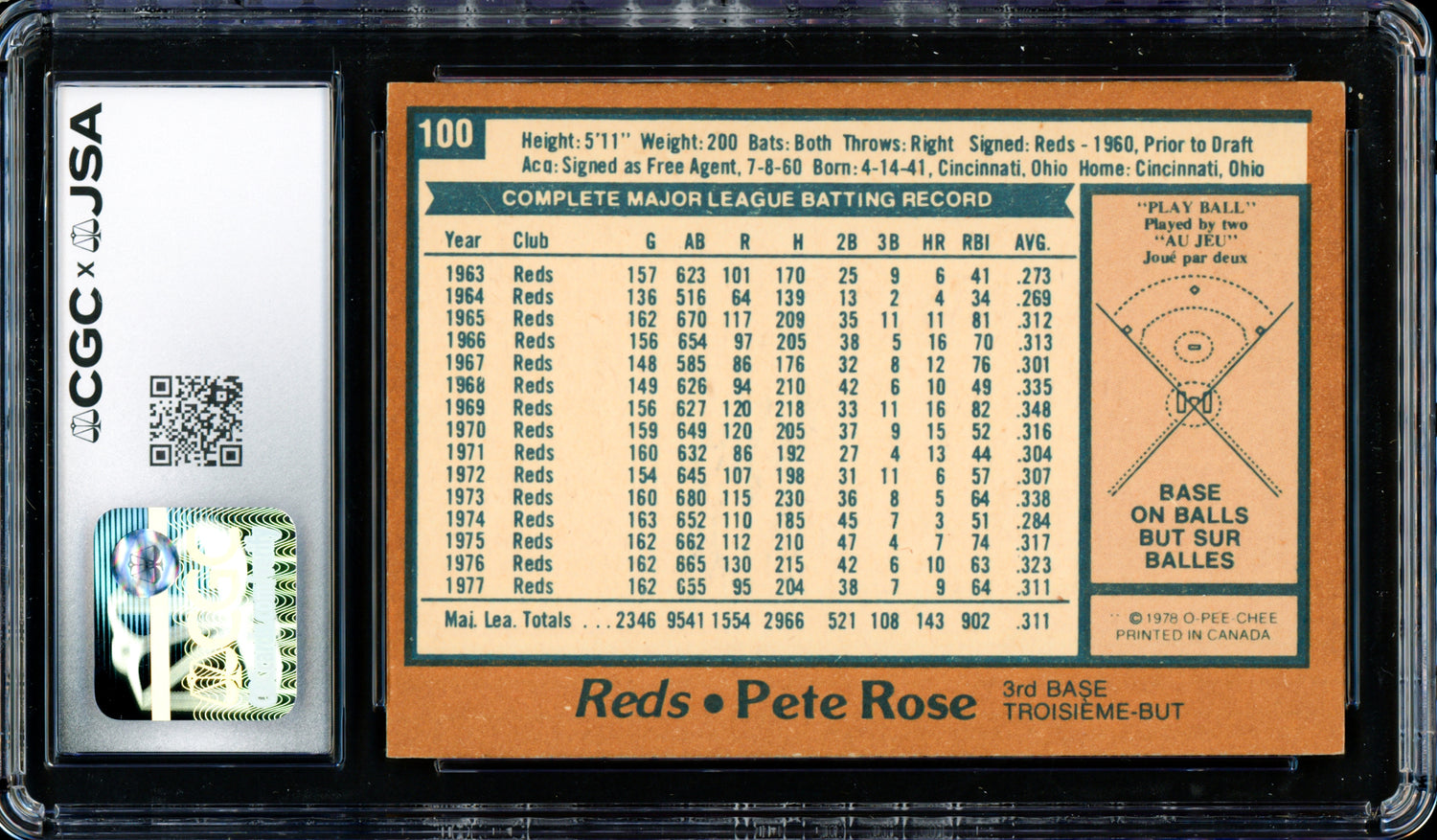 Pete Rose Autographed 1978 O-Pee-Chee Card #100 Cincinnati Reds Auto Grade Gem Mint 10 CGC x JSA #6078174118