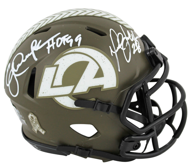 Own a piece of football history with this Autographed Los Angeles Rams Alternate Salute to Service Speed Mini Helmet, personally signed by Hall of Famers Eric Dickerson & Marshall Faulk. This collectible showcases a rare inscription, "HOF 99 (Dickerson)," making it a must-have for dedicated Rams fans and memorabilia collectors.