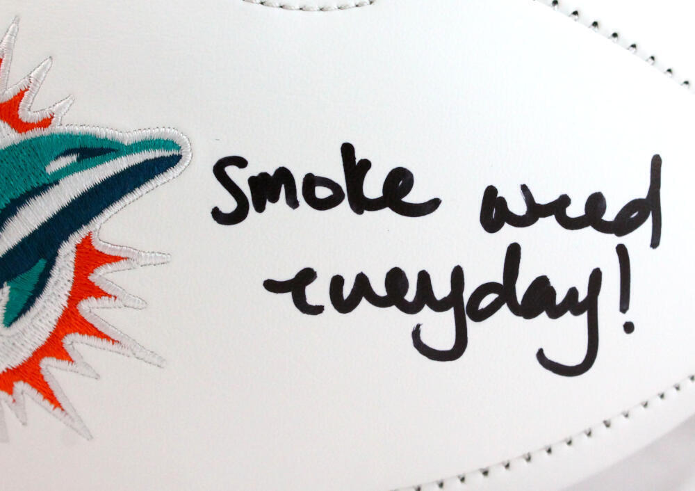 Own a unique piece of NFL history with this hand-signed Ricky Williams Miami Dolphins Logo Football, featuring his iconic inscription, "Smoke Weed Everyday." This autographed football is a must-have collectible for Dolphins fans and memorabilia enthusiasts alike. Each signature is certified authentic by Beckett Authentication, ensuring its legitimacy and value.