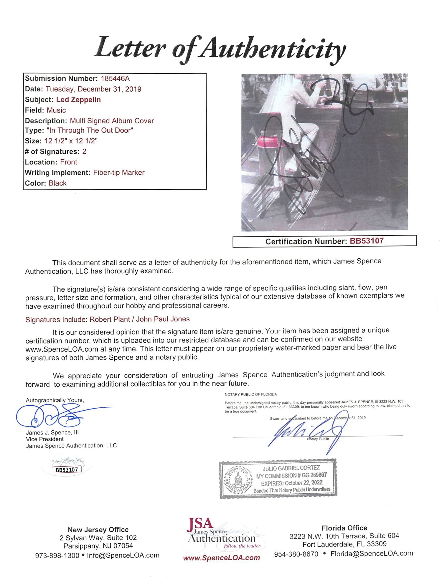 Own a piece of rock history with this Autographed "In Through the Out Door" Album Cover with Vinyl, personally signed by Robert Plant and John Paul Jones of Led Zeppelin. This collector’s item is a must-have for fans of the legendary band and serious memorabilia enthusiasts.