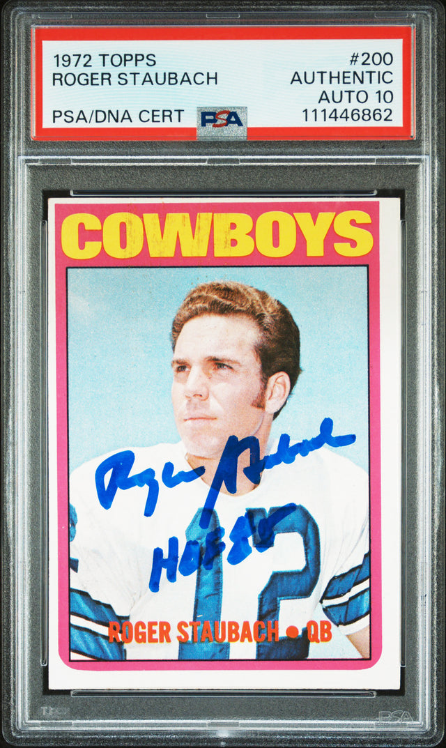 Celebrate NFL greatness with this Autographed Auto Graded Gem Mint 10! 1972 Topps #200 Roger Staubach Rookie Card. A must-have for serious collectors and Dallas Cowboys fans, this iconic card showcases the Hall of Fame legacy of one of football's all-time greats. Personally signed by Roger Staubach, this card features the personalized inscription "HOF 85", commemorating his enshrinement into the Pro Football Hall of Fame in 1985. Professionally slabbed and authenticated by PSA/DNA, this rare collectible promises top-tier authenticity and long-term value. Roger Staubach, a Heisman Trophy winner and Super Bowl VI MVP, remains a Dallas Cowboys legend who helped define an era of dominance in the 1970s. This graded Gem Mint 10 autographed rookie card is a historical treasure every Cowboys supporter and NFL memorabilia enthusiast will admire.
