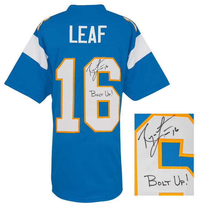 Celebrate a piece of NFL history with this Ryan Leaf signed powder blue custom football jersey, featuring the spirited "Bolt Up" inscription—an electrifying nod to his time with the San Diego Chargers. Once one of the most talked-about quarterbacks of the late 1990s, Ryan Leaf remains a notable figure in football lore, and this signed jersey is a must-have for fans of the Chargers and collectors of unique sports memorabilia.