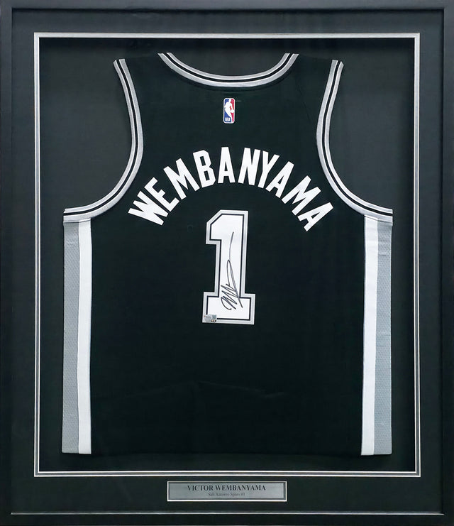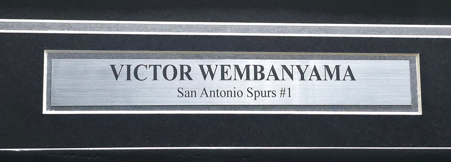 Celebrate the meteoric rise of a basketball phenom with this stunning, professionally framed Black Nike San Antonio Spurs Swingman Icon Edition Jersey, autographed by none other than Victor Wembanyama. Measuring approximately 31x36 inches with the frame, this display-ready piece is a must-have for serious sports memorabilia collectors and devoted Spurs fans. Wembanyama, the No. 1 overall pick in the 2023 NBA Draft, is redefining the game with his rare combination of size, skill, and agility—making this autographed jersey a true investment in basketball history.