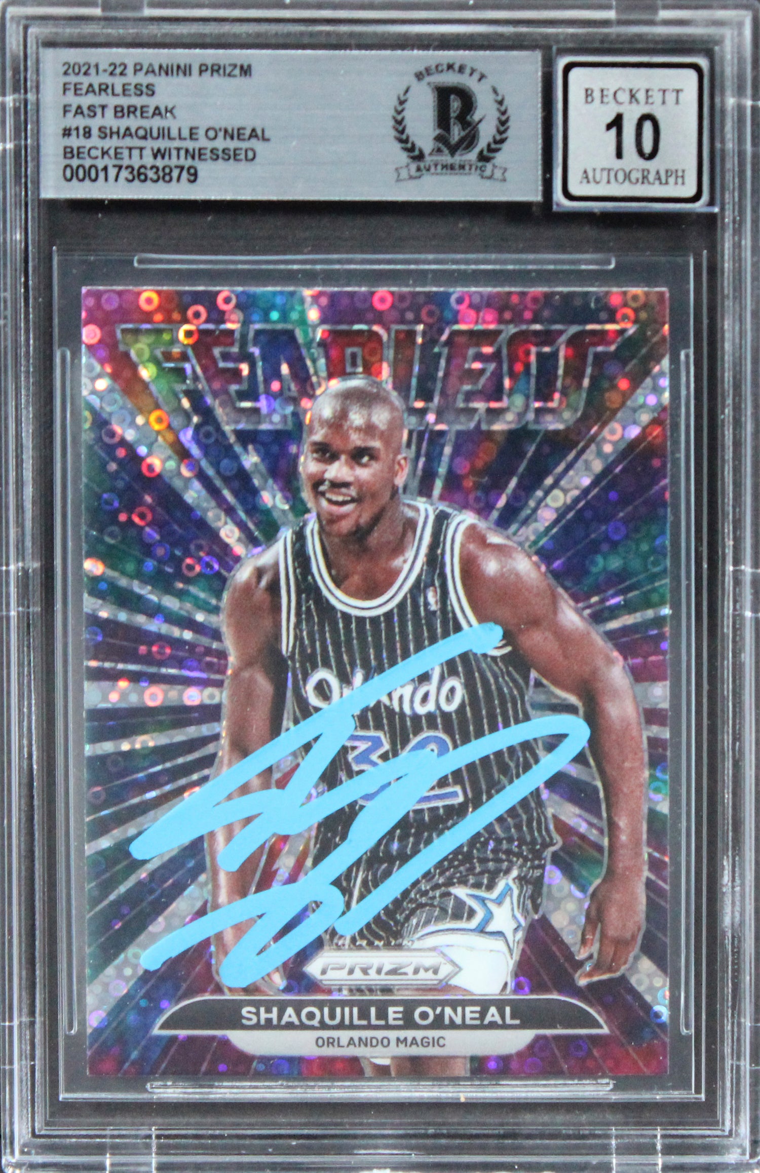 Own a piece of basketball history with this Autographed Auto Graded Gem Mint 10! 2021 Panini Prizm Fearless Fast Break #18 Card, personally signed by Shaquille O'Neal during his time with the Orlando Magic. This stunning collectible is the perfect addition for serious fans and collectors of NBA memorabilia.