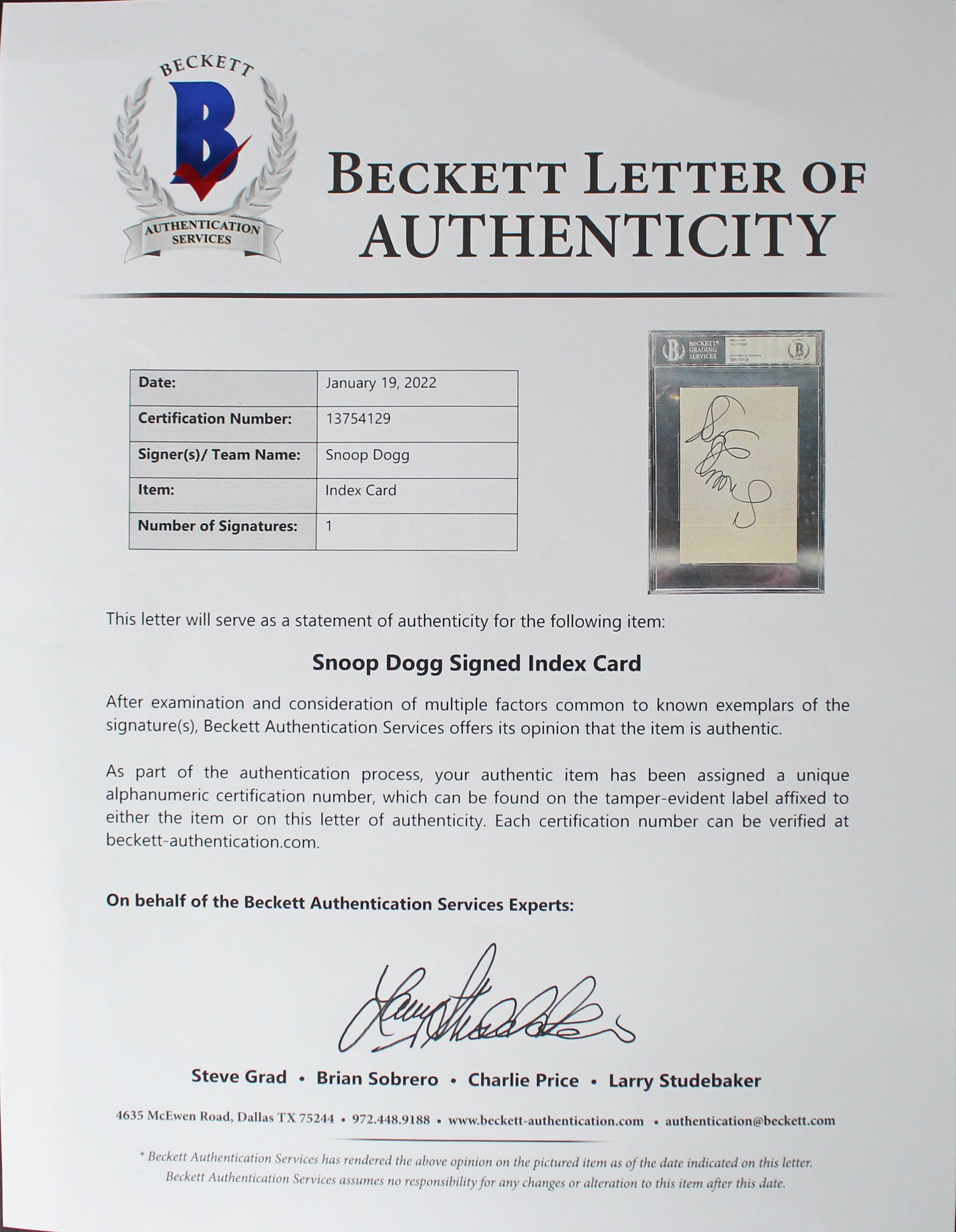 Snoop Dogg’s influence spans decades, shaping music, entertainment, and pop culture. This signed index card is a tangible connection to his legendary career—an ideal addition to any memorabilia collection. Secure this authenticated autograph today and celebrate the legacy of one of hip-hop’s greatest icons!