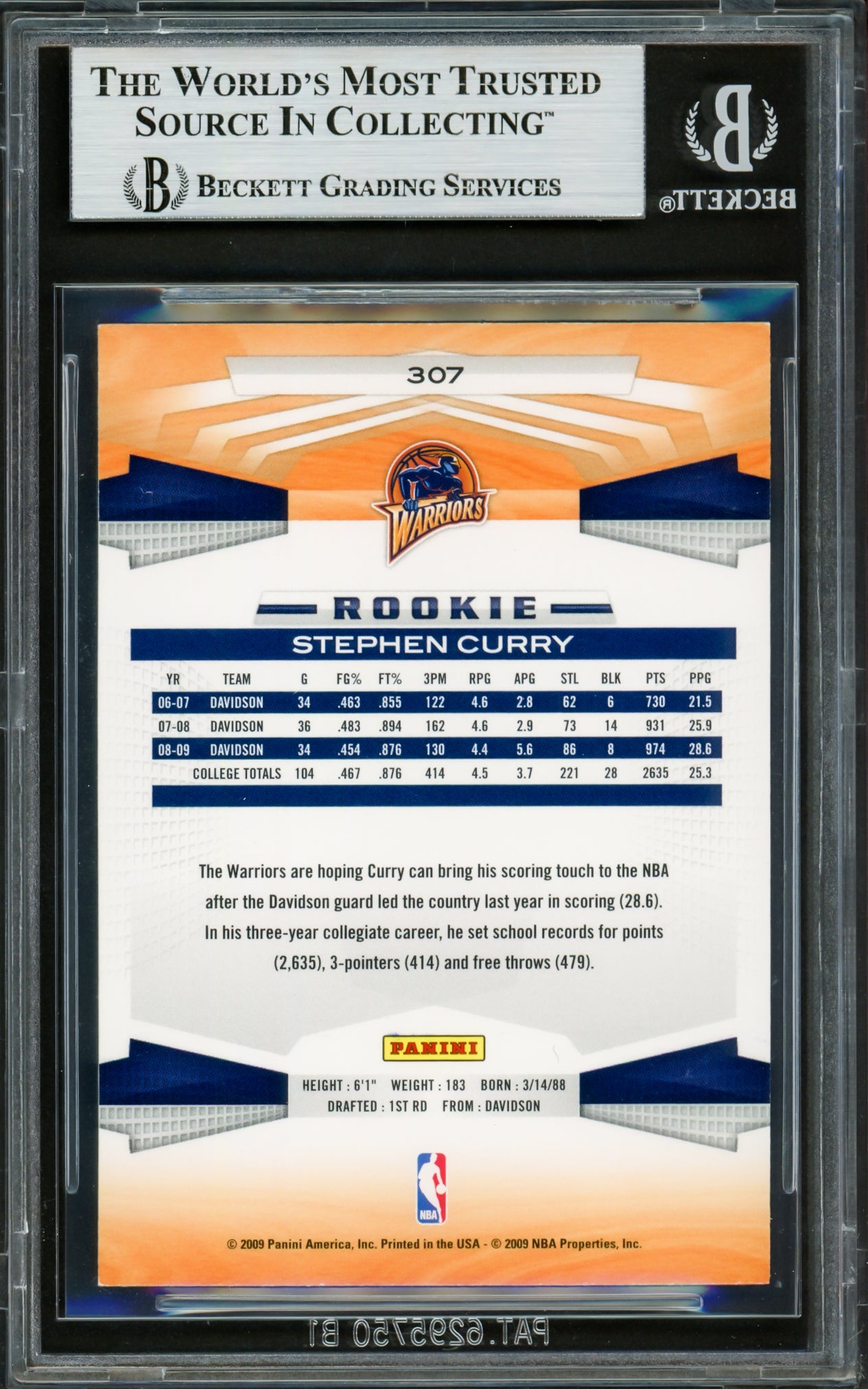 Stephen Curry Autographed 2009-10 Panini Rookie Card #307 Golden State Warriors Beckett BAS #16713301