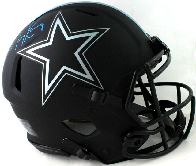Celebrate your Dallas Cowboys pride with this stunning Tony Romo Autographed Dallas Cowboys Full-Size Eclipse Speed Authentic Helmet. A must-have for any serious football memorabilia collector or passionate Cowboys fan, this helmet is authenticated and ready to take center stage in your collection. Former Pro Bowl quarterback Tony Romo left an indelible mark on the NFL with his arm, leadership, and charisma—now you can own a rare piece of that legacy with this signed, full-size Riddell Eclipse Speed Authentic helmet, boldly autographed in blue ink. Featuring a matte black “Eclipse” design that adds a dramatic flair, this helmet makes an eye-catching display in any man cave, office, or sports bar.