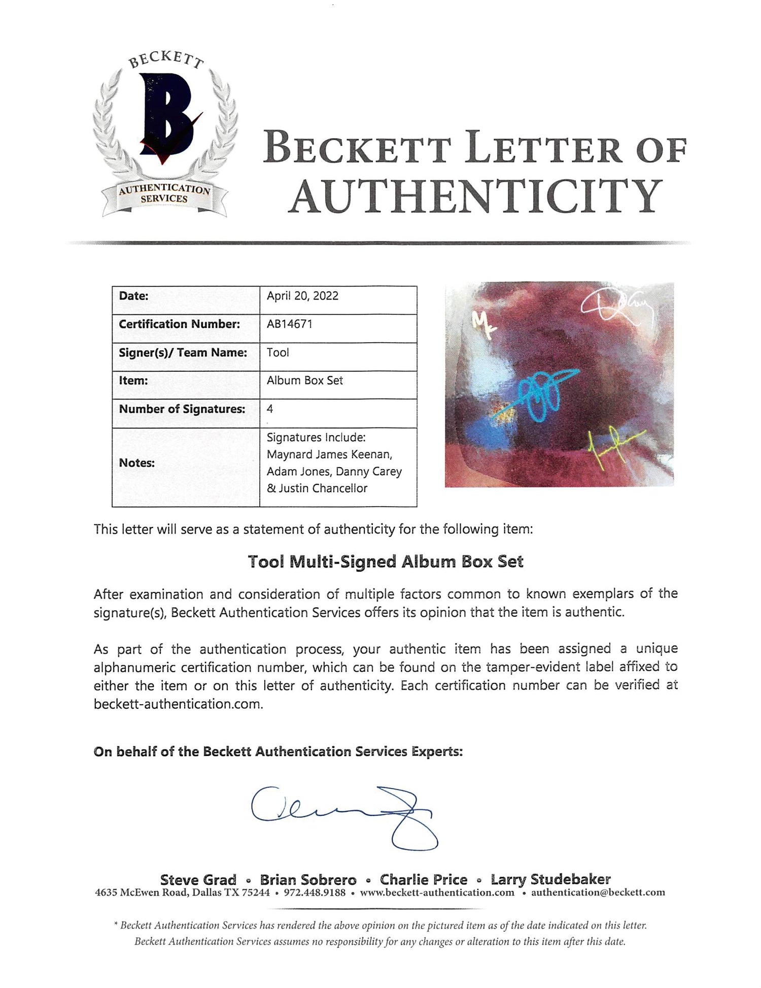 - Officially Autographed: Signed by all four members of Tool—Maynard James Keenan, Adam Jones, Danny Carey & Justin Chancellor.