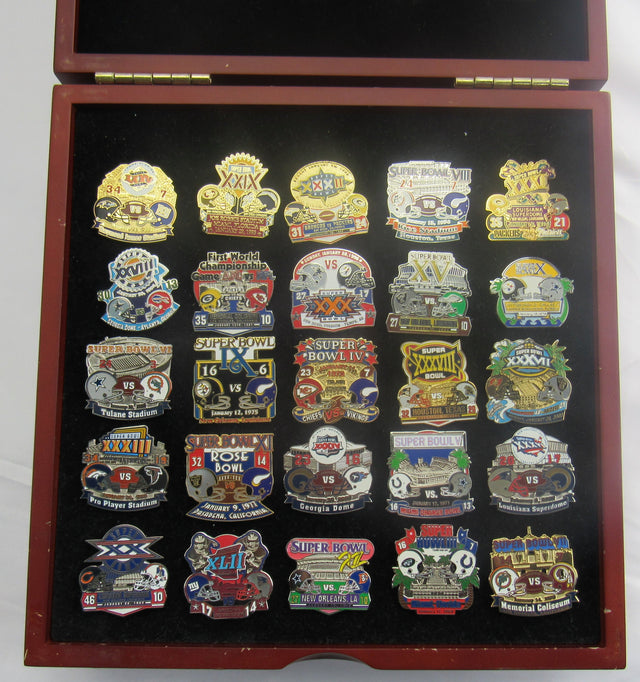 Complete Set of Super Bowl I - XXV Lapel Pins (1-25) NFL Comes in Original Box is backordered and will ship as soon as it is back in stock.