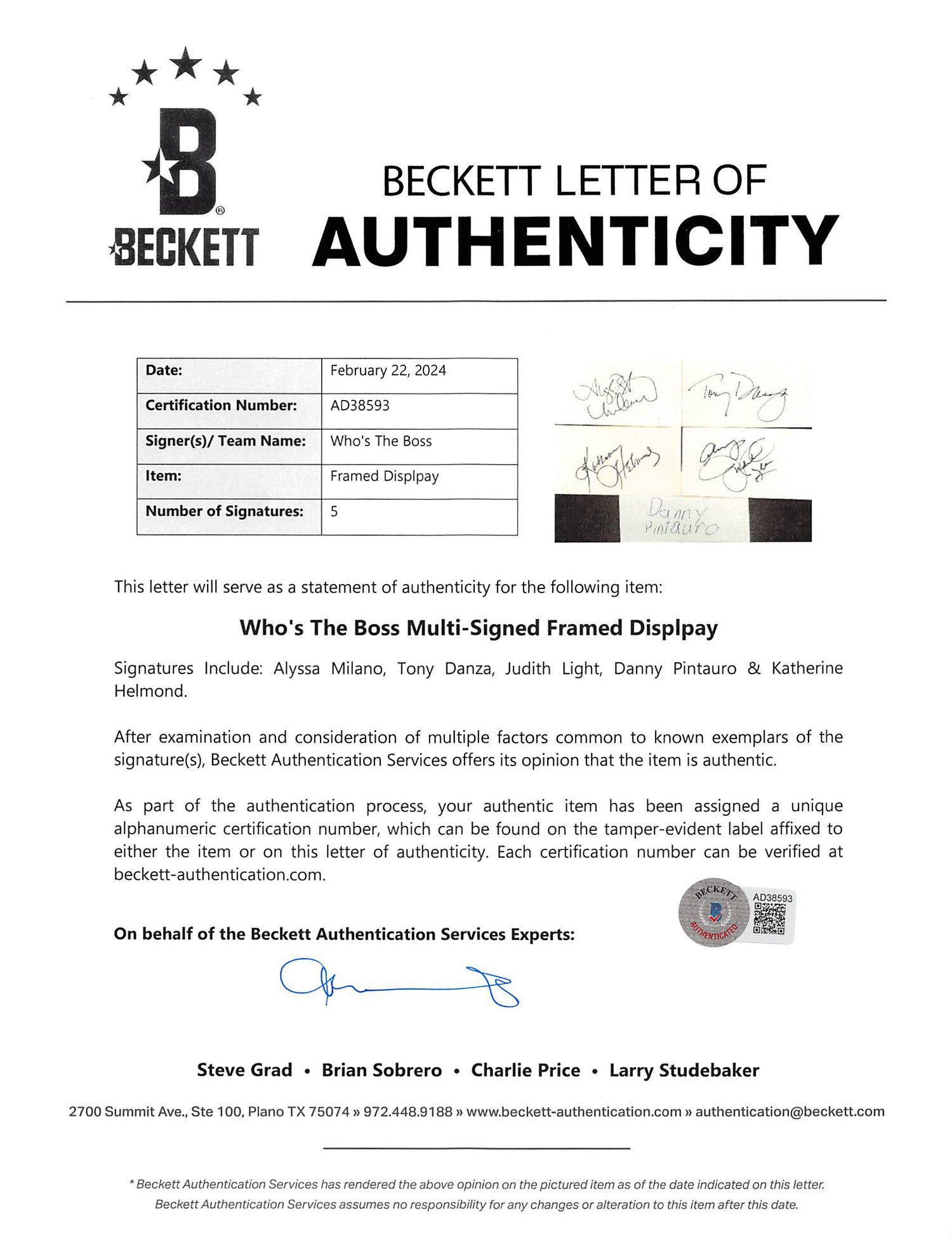 - Personally autographed by Alyssa Milano, Tony Danza, Judith Light, Danny Pintauro & Katherine Helmond – all stars of the hit sitcom "Who’s the Boss?"